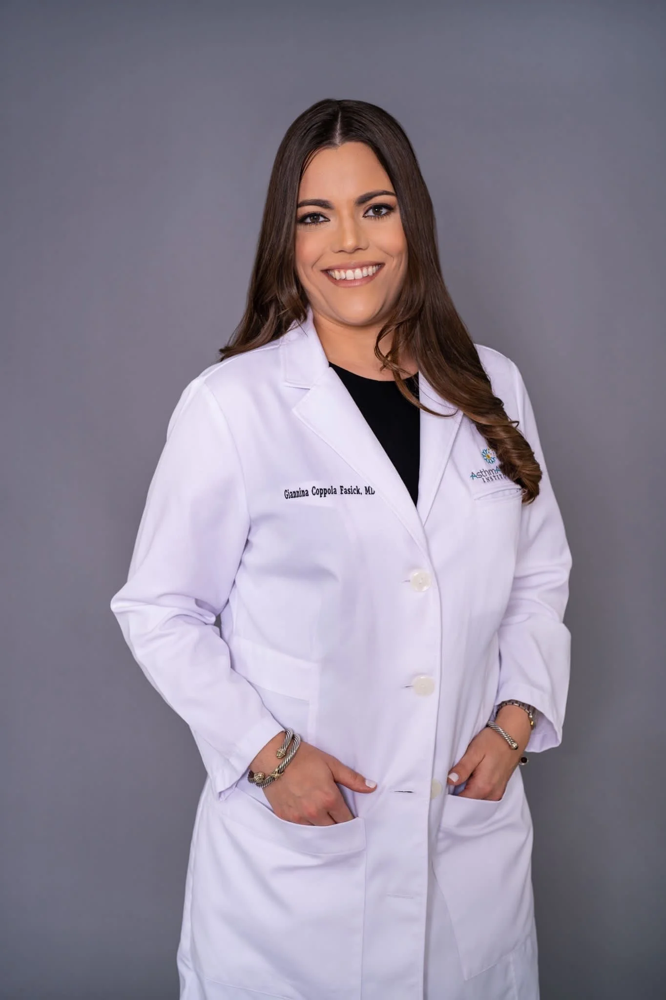 La Dra. Giannina Coppola Fasick obtuvo su doctorado en medicina en a Escuela de Medicina de la Universidad Central del Caribe. Completó una especialidad en Medicina Interna en el Hospital de Veteranos de San Juan y culminó su subespecialidad en Alergia e Inmunología para niños y adultos en la Universidad de Puerto Rico, Recinto de Ciencias Médicas.